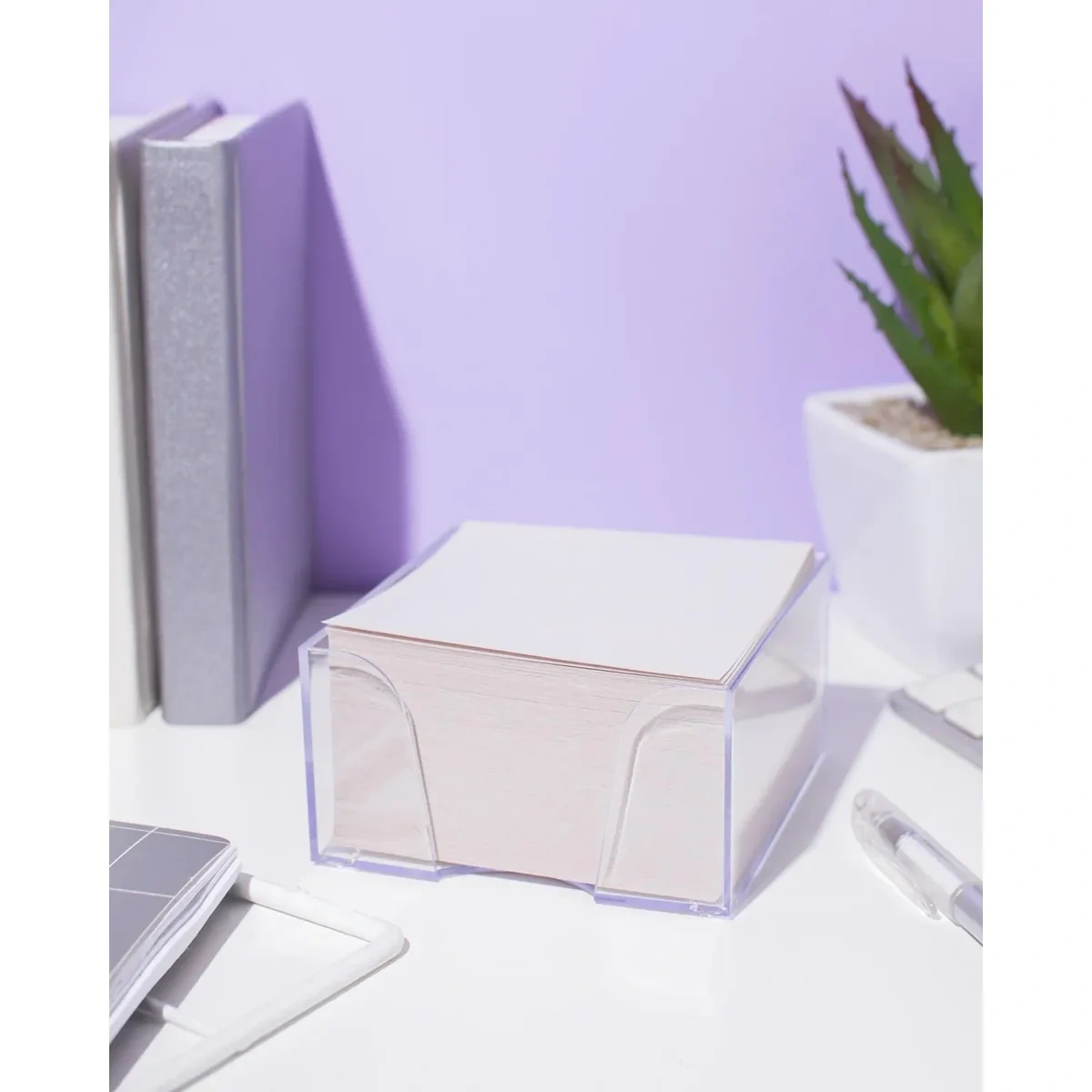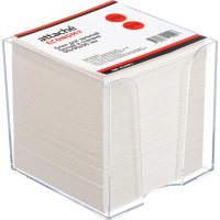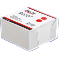 Блок высотой 5 см сложен из квадратных листов размером 9x9 см и вложен в прозрачный пластиковый бокс. Листы не склеены между собой. Они изготовлены из бумаги экономкласса плотностью 65 г/кв.м и белизной 70-80%. Цвет бумаги - оттенок белого, близкий к светло-серому.