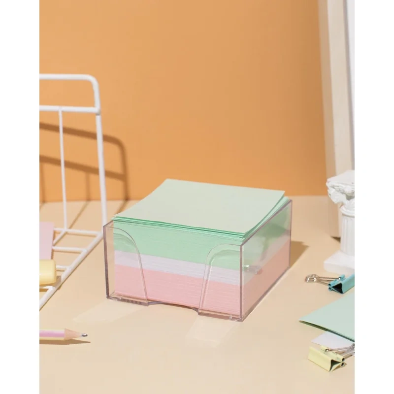 Блок высотой 5 см состоит из сложенных квадратных листов размером 9x9 см, вложенных в прозрачный пластиковый бокс. Листы не склеены между собой и изготовлены из высококачественной офсетной бумаги плотностью 80-100 г/кв.м. В боксе представлены листы трех цветов: белого, зеленого и розового.