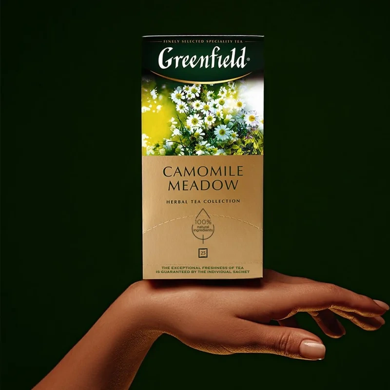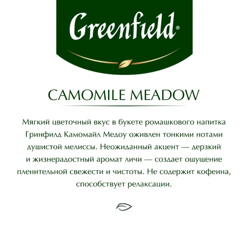 Чай травяной Greenfield Camomile Meadow 25 пакетиков. Травяной чай из нежных цветов ромашки с шиповником, мелиссой и ароматом личи. Мягкий цветочный вкус в букете ромашкового чая Камомайл Медоу оживлен тонкими пряными нотами душистой мелиссы. Неожиданный акцент — дерзкий и жизнерадостный аромат личи — создает ощущение пленительной свежести и чистоты. Ромашка является сильным естественным антисептиком и природным профилактическим средством против простудных заболеваний.