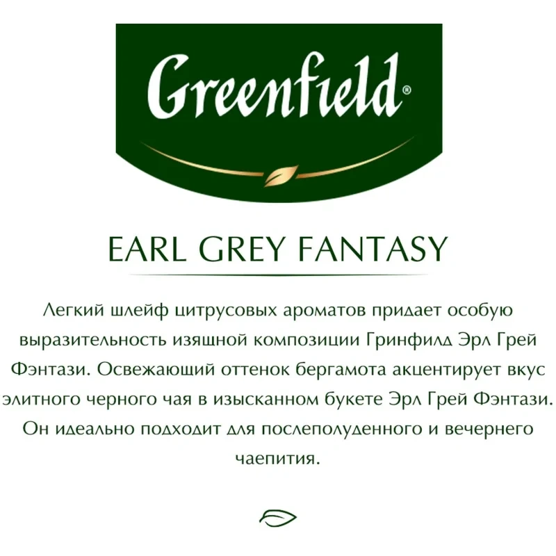 Чай чёрный Greenfield Earl Grey Fantasy 25 пакетиков (бергамот). Чёрный цейлонский чай с ароматом бергамота. 25 металлизированных пакетиков. Воздушный шлейф цитрусовых ароматов подчёркивает выразительный вкус цейлонского чая с плантаций Ува и придаёт особую утончённость изящной композиции Greenfield Earl Grey Fantasy.