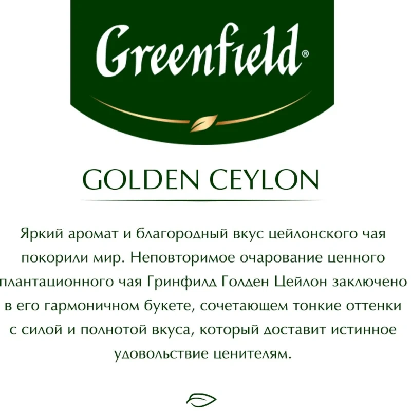 Чай Greenfield Golden Ceylon черный пакетированный 100 пакетиков по 2 г. Крупнолистовой цейлонский чай из провинции Ругуну, расположенной на юге острова Цейлон. Яркий аромат и благородный вкус цейлонского чая покорили мир. Неповторимое очарование ценного плантационного чая Голден Цейлон заключено в его гармоничном букете, сочетающем тонкие оттенки с силой и полнотой вкуса, который доставит истинное удовольствие ценителям. Можно пить в течение всего дня. Уникальные природные и климатические условия Цейлона идеальны для чайного растения, поэтому во всем мире цейлонский чай ценят за удивительный мягкий вкус и неповторимый аромат. Вкус цейлонского чая можно признать классическим, он гармоничный, хорошо сбалансированный. В букете Голден Цейлона сила и полнота сочетаются с тонкими оттенками. Чай сдержанной крепости с изысканным, ярким ароматом, присущим элитным цейлонским чаям. Прекрасно подходит для вечернего чаепития.