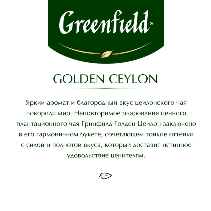 Чай чёрный Greenfield Golden Ceylon 25 пакетиков. чёрный чай Greenfield Golden Ceylon произведён из элитного цейлонского сырья. Тонкий нюанс пряного благородного вкуса подчеркнут изысканным ярким ароматом. Напиток впечатляет золотисто-янтарным красивым оттенком. Чёрный чай Greenfield Golden Ceylon уложен в 25 бумажных фильтровальных пакетиков. Они помещены в индивидуальные фольгированные упаковки. Фольга оптимально сохраняет свойства продукта, препятствует отсыреванию, проникновению посторонних запахов, защищает от ультрафиолета.