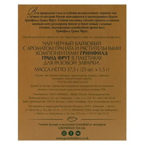 Чай черный Greenfield Grand Fruit 25 пакетиков (розмарин, гранат). Вся природная сила и глубина великолепного черного чая с лучших плантаций Индии воплощается в многогранном букете Greenfield Grand Fruit. Сочная кислинка спелого граната и свежая хвойная нота розмарина вносят в букет новые сложные оттенки, подчеркивая самобытный яркий вкус Greenfield Grand Fruit.