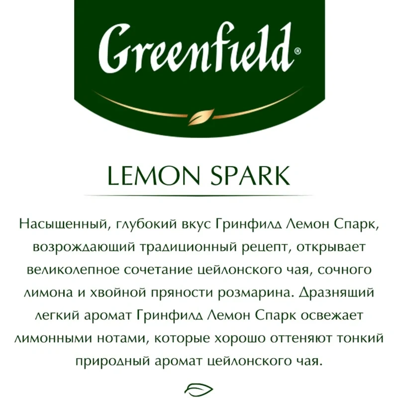 Чай чёрный Greenfield Lemon Spark 25 пакетиков (лимон, розмарин). Чёрный чай обладает насыщенным вкусом с лёгким освежающим ароматом лимонных нот. Насыщенный глубокий вкус чёрного чая с сочными освежающими нотками лимона — выбор большинства любителей чайных напитков. Невероятный лимонный аромат, наполняющий пространство, изящно сочетается с крепким вкусом чёрного чая. Считается, что впервые дольку лимона в чай добавили именно в России, поэтому такой напиток является традиционным и широко распространённым среди поклонников чая.
