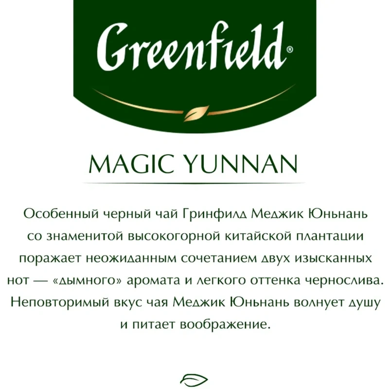 Чай чёрный Greenfield Magic Yunnan 100 пакетиков. Великолепный чёрный чай, выращенный на знаменитых высокогорных плантациях китайской провинции Юньнань, поражает неожиданным сочетанием двух изысканных вкусовых нот — «дымного» аромата и лёгкого оттенка чернослива. Неповторимый вкус чая Magic Yunnan волнует душу и питает воображение.