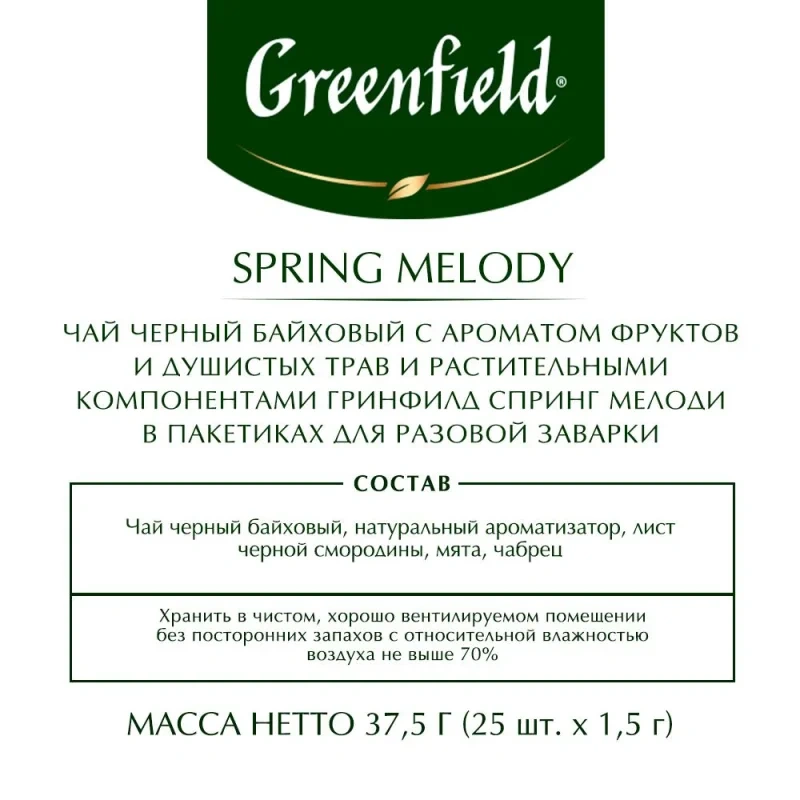 Чай чёрный Greenfield Spring Melody 25 пакетиков. Чёрный чай в пакетиках Greenfield Spring Melody с чабрецом. Композиция чая составлена из отборного индийского чая, мяты и смородиновых листьев, хорошо ощущается вкус чабреца — свежий, пряный и насыщенный.