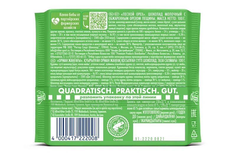 Шоколад Ritter Sport 100г с лесным орехом, молочный